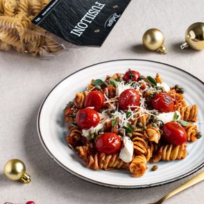 Tagliatelle z salsą pomidorową, stracciatellą i chipsami z prosciutto crudo